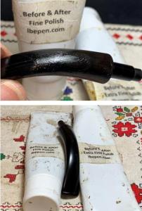 Following the micromesh pads, ‘Before & After’ Fine and Extra Fine Polish are applied to the stem. Starting with the Fine Polish, with a small amount on the finger, the polish is worked into the surface and then wiped off and buffed with a paper towel. The same is done with the Extra Fine Polish. The stem looks great.