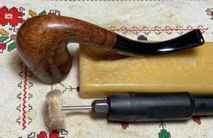 After another cotton cloth buffing wheel is mounted at the same speed, Carnauba wax is applied to the pipe. After the wax, a microfiber cloth is used to give the pipe a rigorous hand buffing to remove the excess wax and to raise the shine.