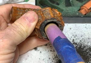 Finally, the vestiges of cake are removed by sanding the chamber with 220 paper wrapped around a dowel rod.