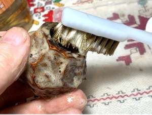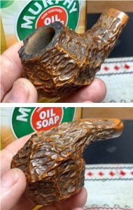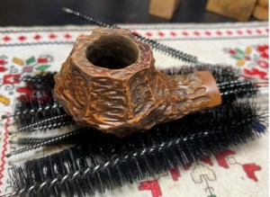 The rim has a crusty lava flow over it, and this is a bit of a challenge with the sculpted rim surface. A brass wire brush is used for this. The brass brush lends some muscle to the cleaning without damaging the briar.