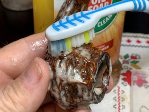A cotton pad is bypassed, and the rough surface of the bowl is scrubbed with Murphy Oil Soap and a bristled toothbrush to dig into the nooks and crannies.