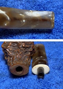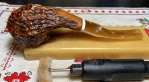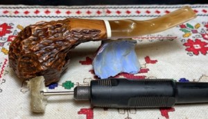 Next, with the stem and stummel reunited, Blue Diamond compound – a fine abrasive, is used on the acrylic stem as well as on the smooth briar panel on the shank’s underside and the smooth ring around the shank facing. The compound is not applied to the rusticated surface. Why? The compound dust would really muck up the rustication getting lodged in the crevasses. It would be a bear to clean. A cotton cloth buffing wheel is mounted on the rotary tool, and with the speed set at about 40% full power, the compound is applied.