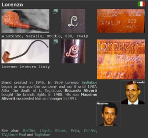 Pipephil.eu has a info panel devoted to Lorenzo (Lor-Lt — Pipes : Logos & Markings) providing the rough history of the name and a few examples to underscore the reputation of ‘edgy’ pipes.
