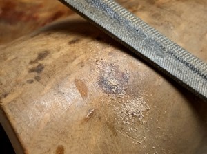 Both flat and square needle files are used to file the patches flush with the stem surface. The button is also refreshed – upper and lower.