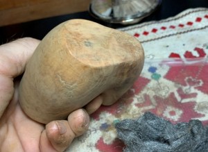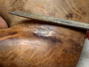 Before applying dye to the stummel, the J-B Weld has thoroughly cured in the chamber. The patch needs to be sanded and smoothed.