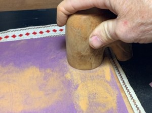 The orange dye wash was applied the night before. Again, to remove the excess dye and fine tune the grain definition, Brown Tripoli compound is applied using a cotton cloth buffing wheel on the rotary tool set at 40% full power.