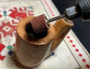 The remedy is to hang the shank over the edge of the board and drag the stummel back-and-forth over 220 grade paper. Not the easiest process but doable. Care is given to keep the rim flush against the paper and not tip the stummel during the back-and-forth movement. To tip the stummel would result in a rim not level.