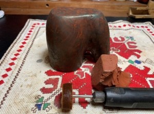 The next morning it’s time to ‘unwrap’ the newly dyed stummel. I use the description of unwrapping because one never knows for sure how the dye was received. The flamed crusted layer is ‘plowed’ off using a coarser felt buffing wheel along with the coarser Brown Tripoli compound. The speed of the rotary tool is about 40% full power.