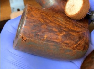 The unwrapping reveals how the dye pigment was received by the grain and the result is more definition in the grain. The grain is spectacular. It looks like fire – great motif for a ‘Spitfire’.