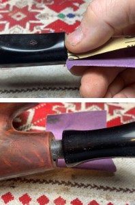 The next morning, before continuing with the stummel polishing process, the stem needs to be reseated into the mortise after the tenon replacement. The tenon is a bit larger than the mortise and is sanded down for a good fit.
