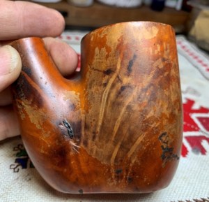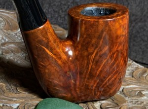 Our pipe has a flattened bottom, a matte finish, a bright orange staining and is an Oom Paul. Unfortunately, no picture examples were offered of an Oom Paul, but this Volcano shape gives a good idea what was in mind with the finish.