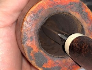 Because of the angle of the picture, you wouldn’t be able to tell that the pipe cleaner is about 1/4 inch exposed after coming through the draft hole. The end of the pipe cleaner in this photo is above the drill hole even with the floor of the chamber. You can see in this photo and the one above that where the cleaner enters the chamber the briar appears to have chipped or worn off with some cracks. The draft hole is positioned a bit too high off the chamber floor. This most likely creates a scenario where tobacco is being left unburned with excess dottle resulting.