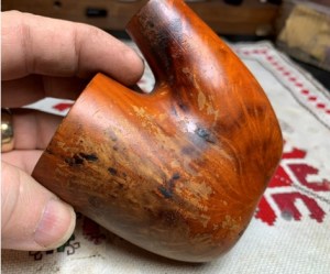 I like the enhanced orange of the stummel with the additional application of dye. One of the pitfalls of doing a dye wash is that the new dye more easily can leech off onto his new steward’s hands when the pipe is first put into service with the heating of the stummel. To help mitigate the possibility of leeching, the stummel is warmed with a hot air gun to emulate the inaugural use of the pipe.