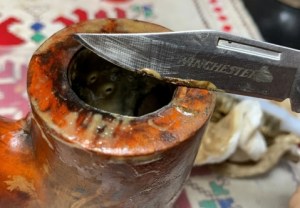 The rim is also carefully scraped with a pocketknife. Care is given to not gouge the rim.