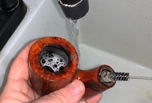 After the external surface is scrubbed the stummel is then taken to the utility sink and the internals are scrubbed with warm water, anti-oil liquid dishwashing soap and shank brushes. After working on the internals, the stummel is thoroughly rinsed and brought back to the worktable.