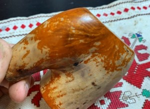 Lorenzo Spilxxx Pxxx Goliath Oom Paul – Oh my! There’s a story behind this one. I found him in Bulgaria and when I first saw him, I fell in love with this guy. I’ve never seen a pipe this big – Oom Paul, and I’ve seen few pipes in worse shape. He looks like someone tried to burn him in the fireplace or something. There are what appear to be scorch marks on the surface. There’s a small crack over the nomenclature, Lorenzo, that isn’t a stress trauma but burn damage to the briar. I think the stem is original, but it’s loose and the tenon/filter cavity (9mm) is broken. The chamber definitely has issues, but the full story will not be known to the world until the old carbon cake is cleared away. I put this pipe in the Pipe Dreamers section to see if anyone could dream big enough. Perhaps you can . I would love to try to help him out of ICU. Putting an estimate is difficult because he’s going to take a good bit of work, and only God knows for sure what he’ll look like in the end. The minimum estimate I give for just about any pipe is $60 because of the time involved. If he turns out better than anyone including me expects – a pipe this size and style – $120. But if he turns out much better but not fireworks, probably $80. If it continues to be ‘bless his heart…’ then $60 and if you don’t want him, I’ll probably keep him just because . I love projects like this.
