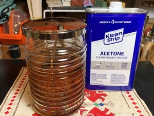 My wife helped by providing me with a larger glass jar that could be sealed to soak the goliath stummel in acetone. The stummel will soak for several hours to loosen the old finish and to clean the internals.