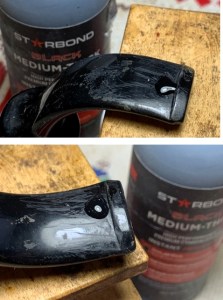 After cleaning the bit with alcohol, Medium-Thick Black CA glue is used to fill the compressions – upper and lower. An accelerator is used to quicken the curing time.