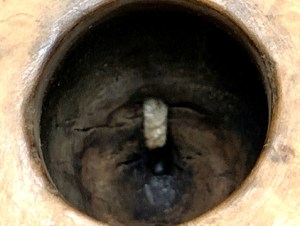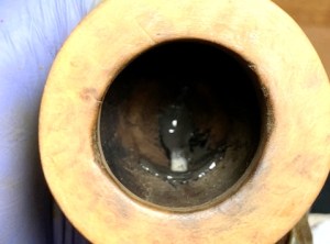 After scraping the cake, coarse 120 grade sanding paper was wrapped around the dowel rod to sand the chamber. This was followed by sanding with 220 grit paper.