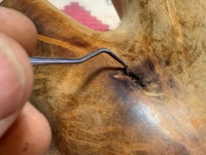 After the hole and chamber floor are built up, some Weld is spread across the upper area of the draft hole filling in cracks and the chips or erosion. While the Weld is still pliable, the pipe cleaner is twisted and moved up and down a bit to make sure everything is good with the airway. The stummel is then set aside to allow the Weld to cure fully in about 4 hours, but after a while the stummel can be handled while the curing process continues. After the Weld fully cures, the sanding will smooth the Weld to blend with the curvature of the chamber.