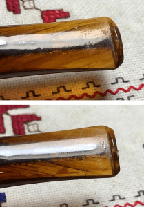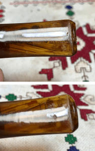 The short acrylic stem has a good bit of chatter, and the lower button lip has a compression that needs mending. The airway can be seen through the acrylic and shows signs of crazing – the little cracking which is often seen with older acrylic Perspex stems put out by GBD. Perspex is not resistant to alcohol and when exposed to alcohol can craze or crack. For our stem, it only impacts the aesthetics.