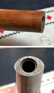 The primary issue with this Comeaux is a malady that overtakes many a Canadians, and with this Canadian’s 7 3/16 inches length – a cracked shank. The long shank which is the hallmark characteristic of the Canadian family of pipes seems to be more vulnerable to shanks cracking. This crack is on the upper side of the shank measuring about 5/8 inches – not a small crack. The crack will need mending, and I’ll need to find a reinforcement band that can be molded around the oval shank. I’ll work through the cleaning process before addressing the crack.
