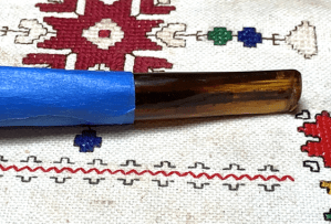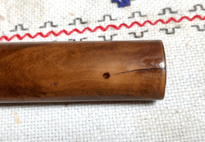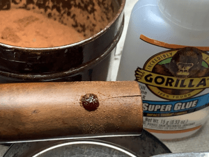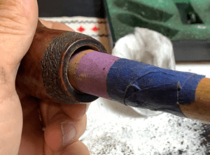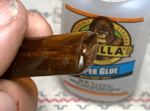 In the picture above the crack is separated a small amount. I use thin CA glue first to place it in the crack. This glue is very light and seeps nicely into the crack to put a deep seal in place. I pinch the shank as tightly as I can for a few minutes while the initial glue cures – it cures quickly. Next, regular CA glue is placed over the crack while the shank is pressed together, and the patch is sprayed with an accelerator to seal the deal. I’m not too concerned about the aesthetics of the end of the shank because most of the crack should be covered (hopefully) by a band.