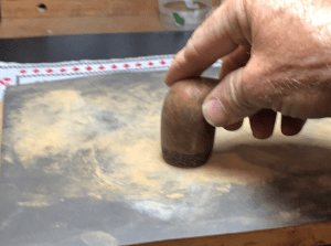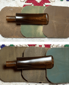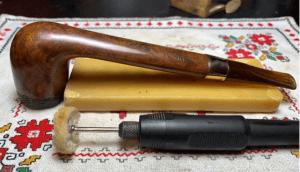 Well, somehow, I missed taking a picture setting up the application of Blue Diamond compound to the pipe. The compound is not applied to the metal band nor to the rusticated stack. I avoid the rustication because the powdery residue will get lodged in the crevasses and this I don’t want. Following the application of the compound, the pipe is wiped with a felt cloth to remove compound dust in preparation for application of the wax.