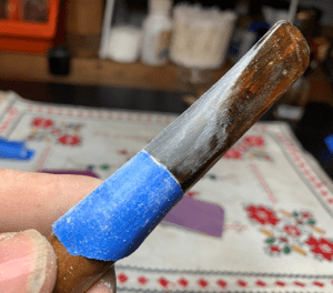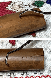 Before proceeding further, I need to address the shank crack. The crack is about 5/8 inches long and it looks like it could easily continue creeping up the shank if not blocked. To block the crack from ‘creeping’ the approach is to drill a counter-creep hole at the end of the crack and fill it with CA glue. After this, CA glue will be applied to crack itself to help shore up the damage. Following this, later, a band will be mounted over the shank to reinforce the shank. First, using a magnifying glass to find the very end of the crack, a sharp dental probe is used to press a small hole at that point. This helps as a guide for the counter-creep hole drilling.