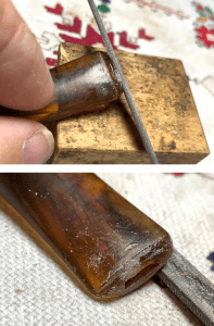 After the patch cures, the process is slow and careful to file the patch flush with the briar surface. My goal is to keep the file on top of the patch so that there’s no collateral impact on the surrounding briar.