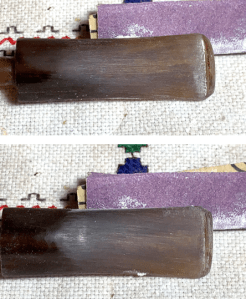 Next, the bit and button are sanded with 220 grit paper to remove the tooth chatter and to blend the button patch.