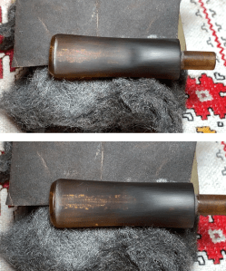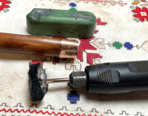 The brass band needs some ‘blinging’ up. Green compound is applied using a dedicated cotton wheel for metals. Polishing metals create a black residue which requires a dedicated buffing wheel. I am careful to keep the wheel on the band and not overrun onto the briar. This will spread the black residue, and this can stain the briar – not good.