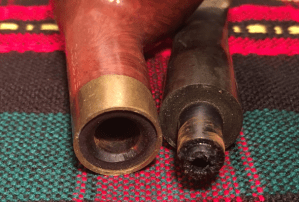 When I first saw the brass band, I wondered if it was a repair band for a shank crack. The band slipped off easily. There is no shank crack and from the perfect inset laith cut around the shank to seat the band, makes it apparent that it was done with skill. I will clean the band with some bling and re-seat it, adding a bit of class to this beleaguered Comoy’s.