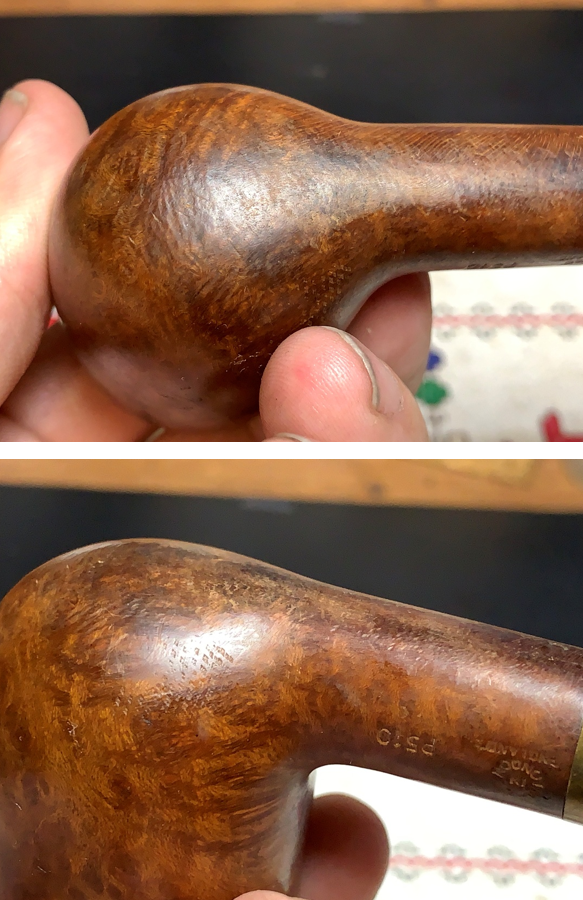 This picture shows the shadow of darkening on the front outer edge of the rim. During the micromesh process I noticed a fill that was not seen earlier. The fill is solid, but now that I see it in the lightened briar after sanding, is more noticeable.