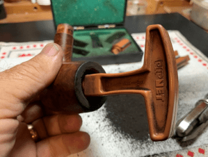 One last mini project before applying the wax. One of the interesting discoveries in the research is that Comoy’s Shape Chart describes the 510 as having a 1/8 bend. The 1/8 bend seems to be one of the characteristics that sets the 500s apart along with them being described as ‘lightweights’ – indicating a smaller pipe in the lineup. The 1/8 bend is the characteristic bend ascribed to a Prince shape which is a classy shape. The subtle bend on our 510 coupled with the band leverages toward that ‘touch of class’ motif. I had a good bit of time to think about Steve’s comment that the subtle bend could have been lost along the way. Therefore, in keeping with the ‘spirit’ of the 510, I decided to introduce a classy 1/8 bend to the stem.