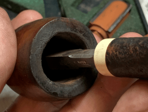 The internal edge of the rim is charred, and the tool scrapes the dead charred briar off. All the damaged wood has to be removed to allow the healthy briar to emerge.