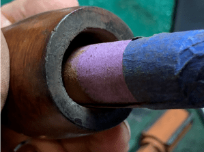 The newly dyed stummel has been resting for several hours and it’s time to ‘unwrap’ the crusted flamed surface. A felt buffing wheel is used to do the plowing with Brown Tripoli compound. Both the felt wheel and compound are more abrasive to do this initial clearing away of the flamed dye.