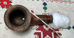 With the late hour having arrived, the internal cleaning will continue with an alcohol and salt soak through the night. This soak helps to clean the stummel but also refreshes the briar. To do this, first a cotton ball is pulled and twisted to form a wick which serves to draw the tars and oils out of the internal briar.