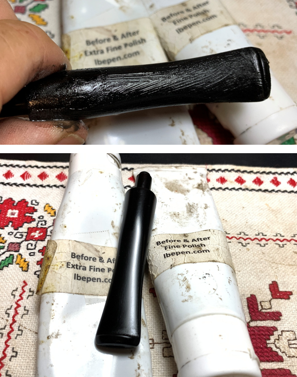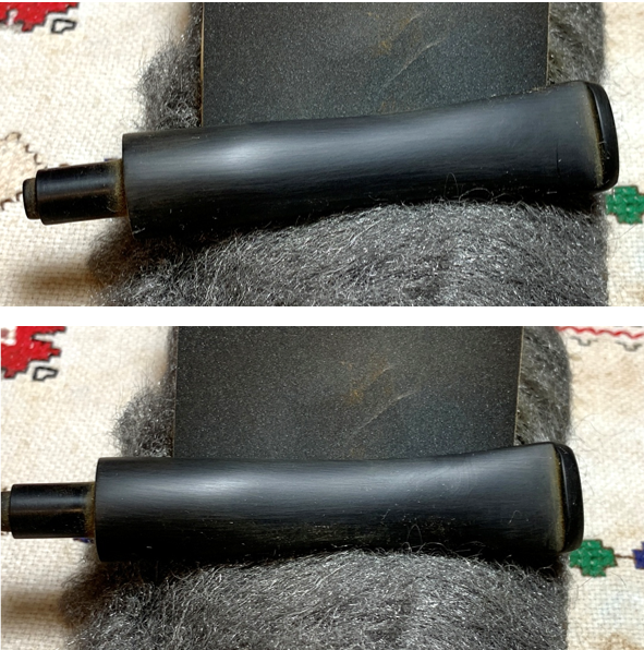 Mark Hoover’s ‘Before & After’ Fine and Extra Fine Polish (Lbepen.com) does a good job conditioning the vulcanite. After putting some of the Fine Polish on the fingers, the polish is worked into the stem surface. After a few minutes of working it into the surface, the Fine Polish is wiped off with a paper towel. The same is done with the Extra Find Polish. The stem looks great.