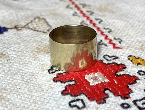 At this point, the brass band needs to be mounted. To do this, a small drop of CA glue is applied to the tip of a toothpick and then the toothpick carefully applies and spreads the glue around the interior of the band. The glue is applied to the middle so that it doesn’t squeeze out and get on the shank when the band is mounted.