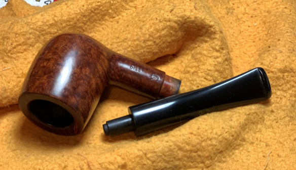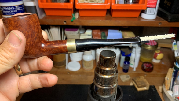 After the stem and stummel are reunited, the finer Blue Diamond compound is applied to stem and stummel. For now, the brass band is not yet mounted because it’s easier to apply the compound with it unmounted.
