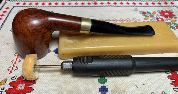The last step is to mount a dedicated cotton cloth buffing wheel to the rotary tool set at about 40% full power. Carnauba wax is applied to stem and stummel, avoiding the band. This is followed by giving the pipe a rigorous hand buffing with a microfiber cloth to remove excess wax and to raise the shine.