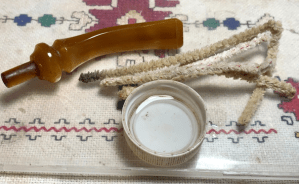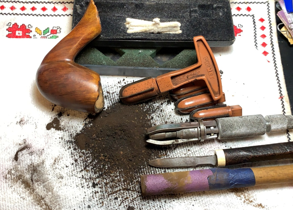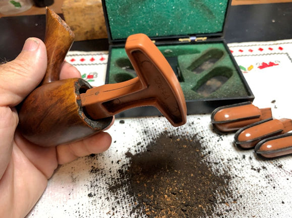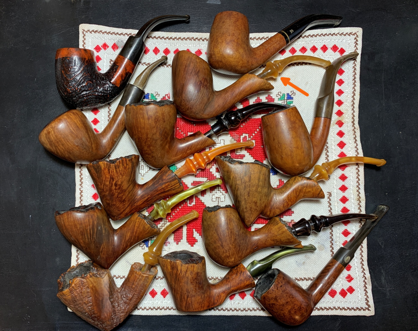 The next pipe on the worktable came to me from a pipeman in nearby Lakewood, Colorado. I met him when I responded to a Facebook Marketplace ad for a Zero Gravity recliner. When I went to his house to eyeball the recliner, I pulled up to the driveway and saw a pipeman in his comfy chair sitting at the end of the driveway nursing his pipe. Of course, conversation ensued, pipeman to pipeman and through the discussion I discovered that he was thinning out his personal collection and he discovered that I collected and restored pipes. After purchasing the recliner Ron invited me to come back when he was able to ferret out some boxes with pipes that he was selling. On my return trip, I learned that Ron had an affinity for Freehands, but he wasn’t too particular about which stem mated with which stummel. He retired in the Denver area after serving our country in WW2 in the Airforce and later in other government jobs. I was especially pleased when I saw his worn-out bible on the side of his chair not gathering dust. Ron and I came to a mutually advantageous agreement and these pipes made there way to my care and were posted in the For “Pipe Dreamers” ONLY! online collection waiting to be commissioned. The arrow marks the Ben Wade now on the worktable.