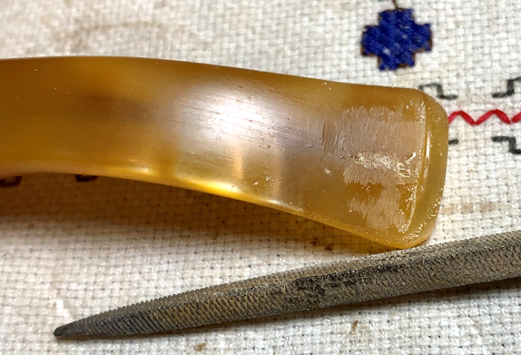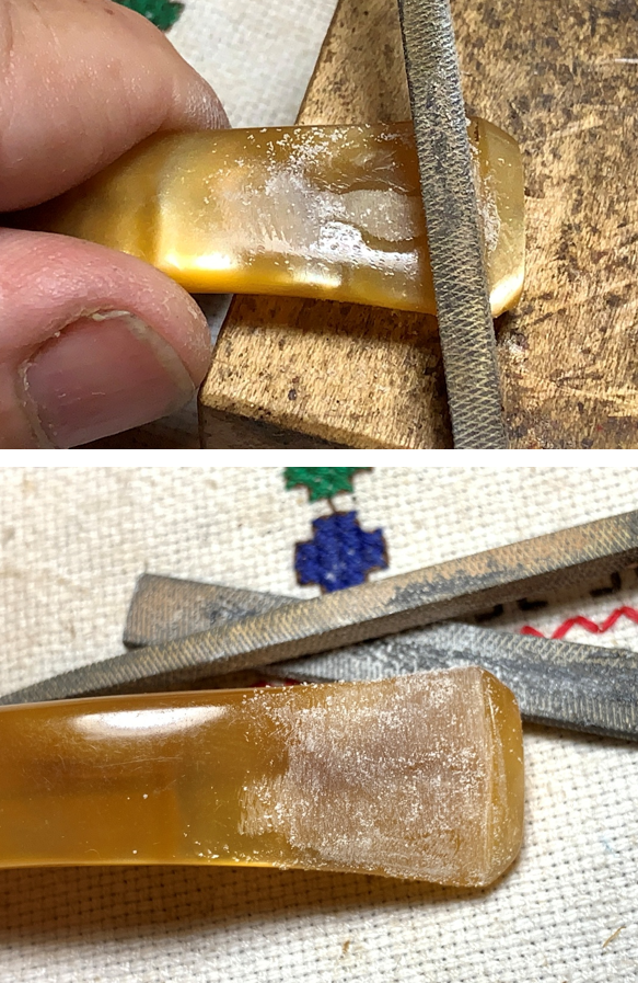 After the patch is cured, the needle file is used to file the patch mound down flush with the briar surface.