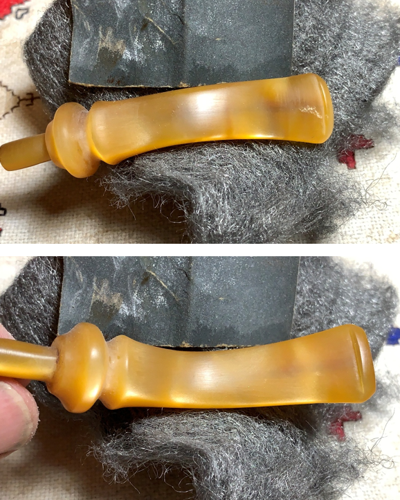 After the sanding with 600 grit paper and steel wool, the patch on the upper bit is noticeable. Here’s the story on this. I used a clear CA glue which means that the rough acrylic beneath the patch is showing through. The surface is smooth to the touch. My ‘pipe OCD’ tendencies take over when I see this. I should have used an amber CA glue which would have masked the rough acrylic beneath….