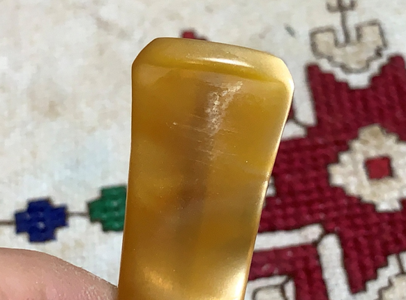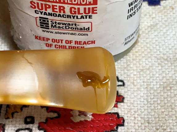 Next, medium thick amber CA glue fills the furrow, and time is given to allow it to cure. This should mask the blemish beneath the amber glue patch.