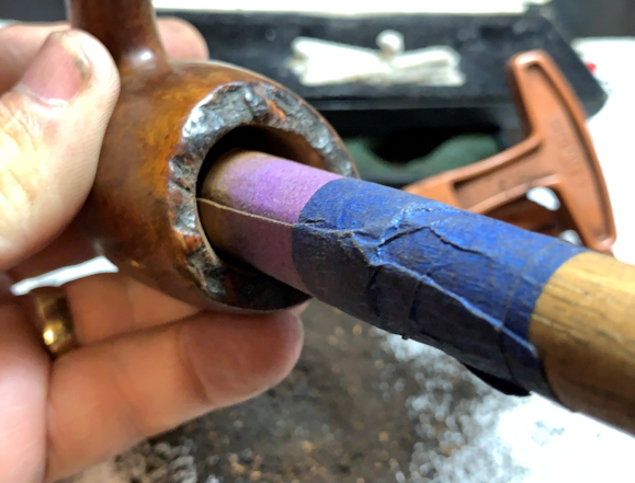 One of the things I like doing with Freehands is to sand more directly inside the jutting peaks of the plateau. I do this so that the steward’s view enjoys a peek of briar grain on the interior of the chamber. First, 220 sanding paper wrapped around the dowel rod is used.