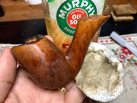 For now, the cleaning continues with the stummel before chamber repairs commence. Next, the external briar surface and the plateaus are cleaned using undiluted Murphy Oil Soap and cotton pads.