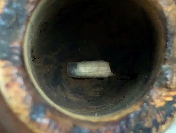 With a pipe cleaner through the draft hole for orientation, the results are shown on the back of the chamber and then the front. Not bad! The pictures show the patches, and the chamber is smooth to the touch. No latent roughness in the chamber. Not shown is a pipe cleaner moistened with isopropyl 99% that is run again through the mortise and airway to remove dust that had accumulated from the sanding drums.
