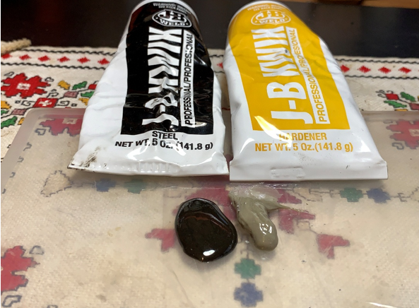 J-B Weld is formed with 2 components – STEEL and HARDENER. Two equal parts are placed on the palette (on the tape!).
